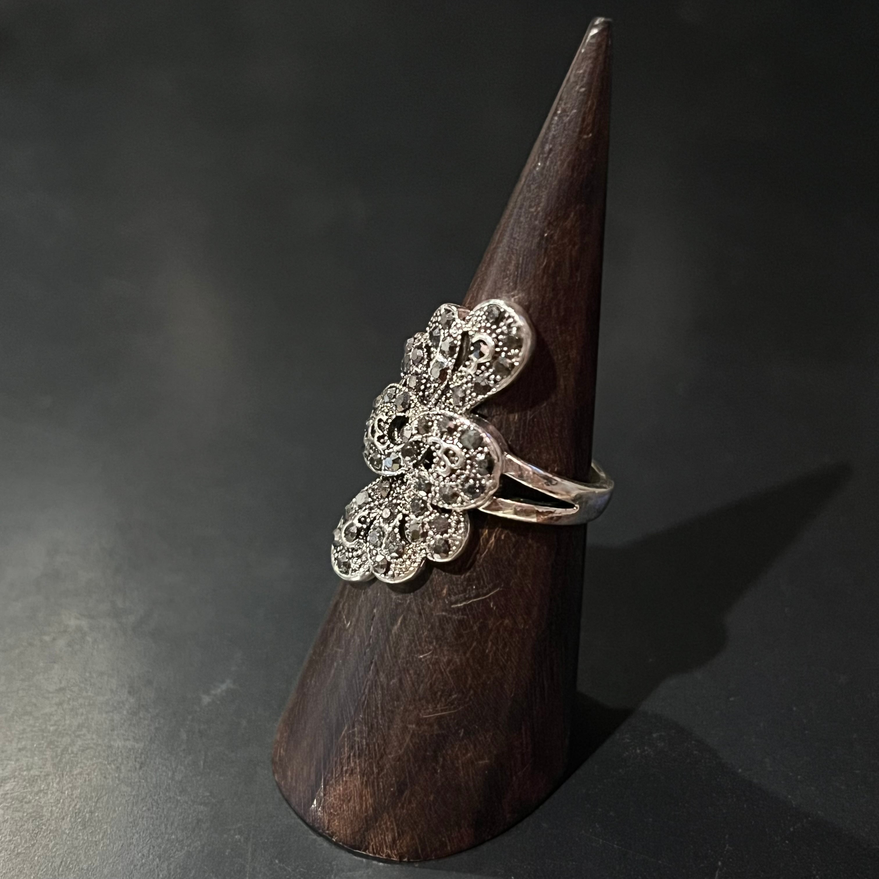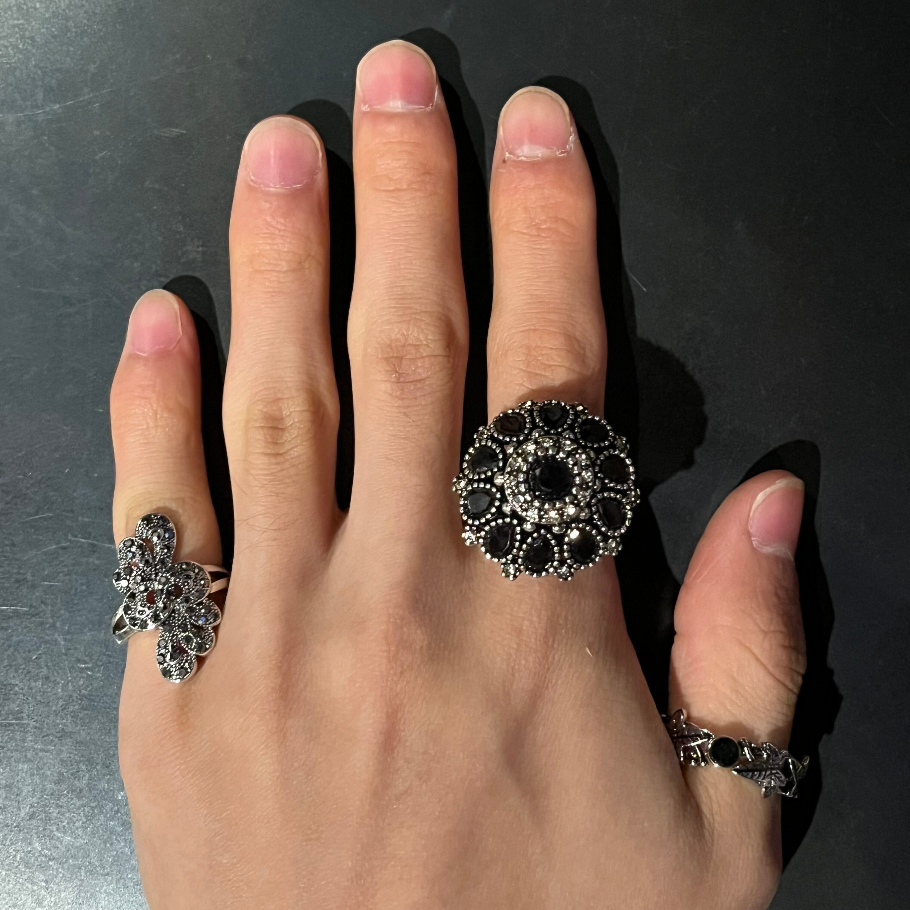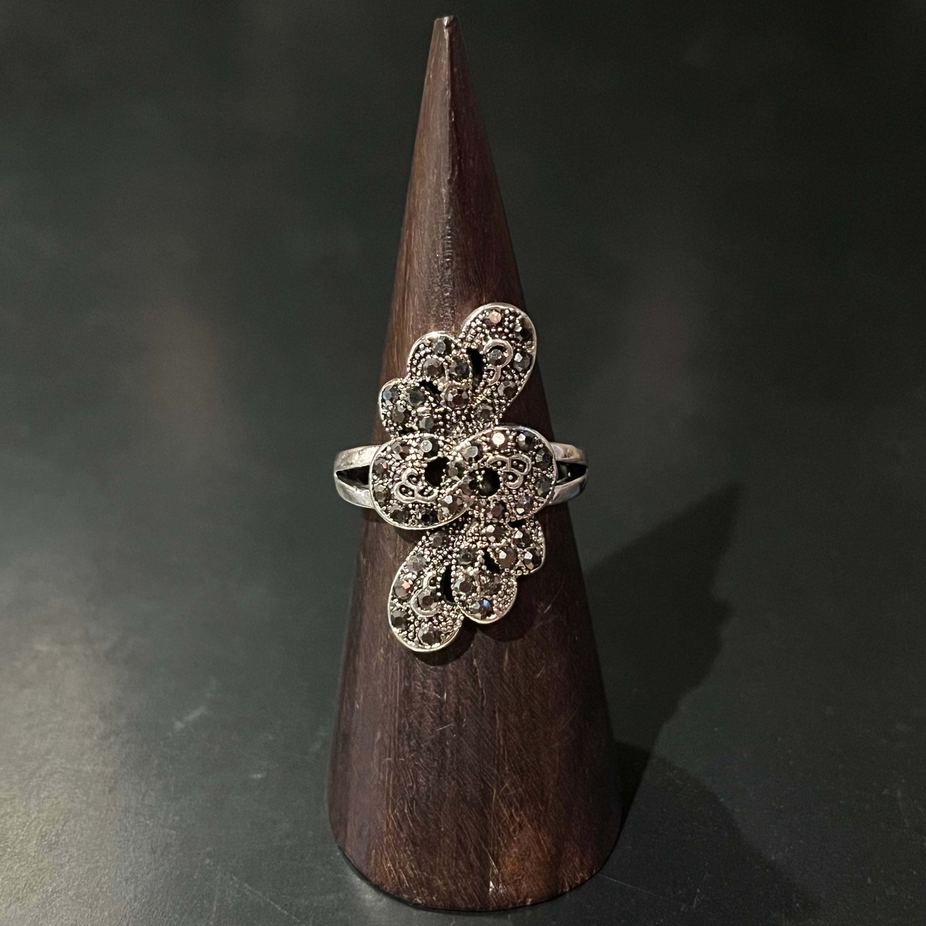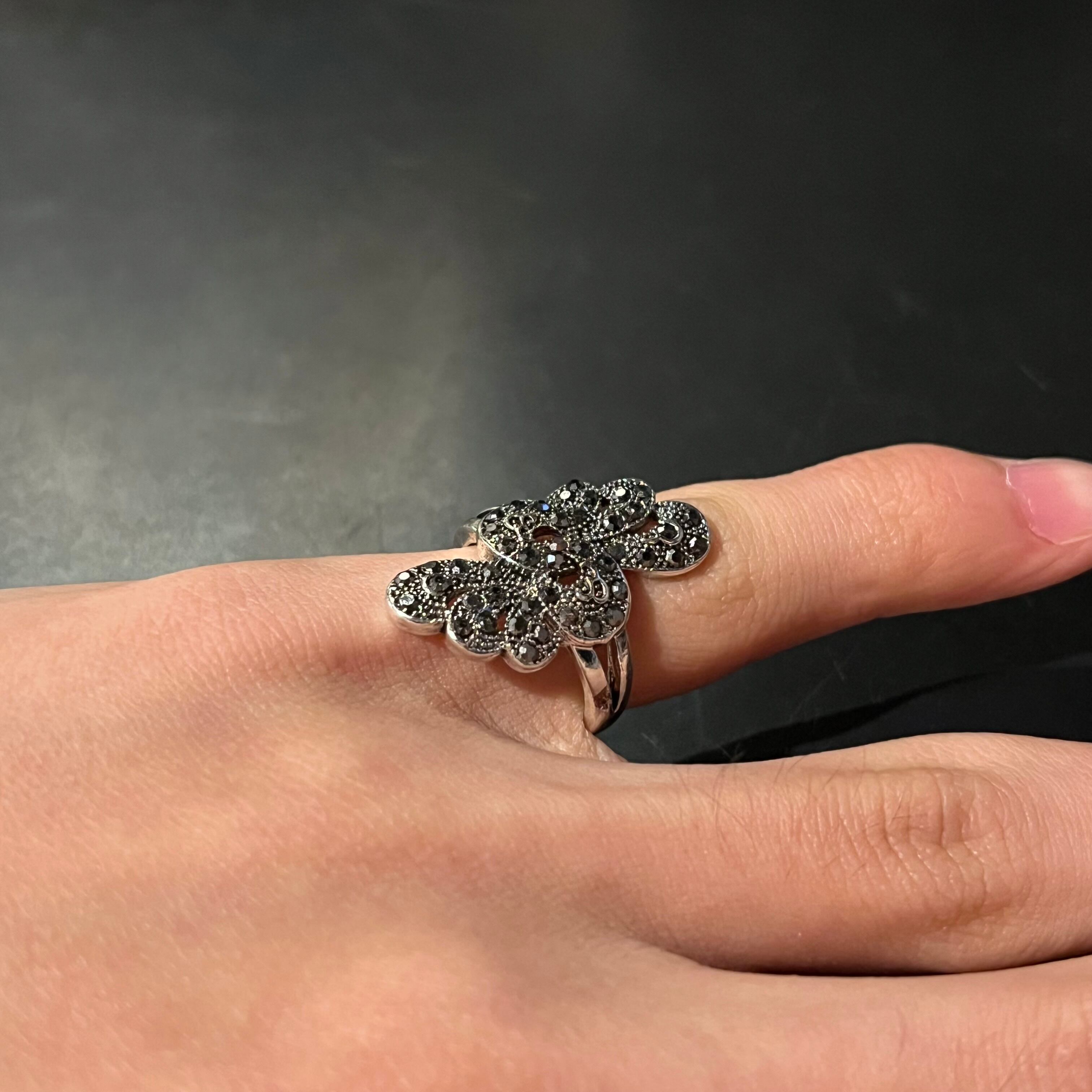 Black Stone Glitter Flower Motif Design Ring